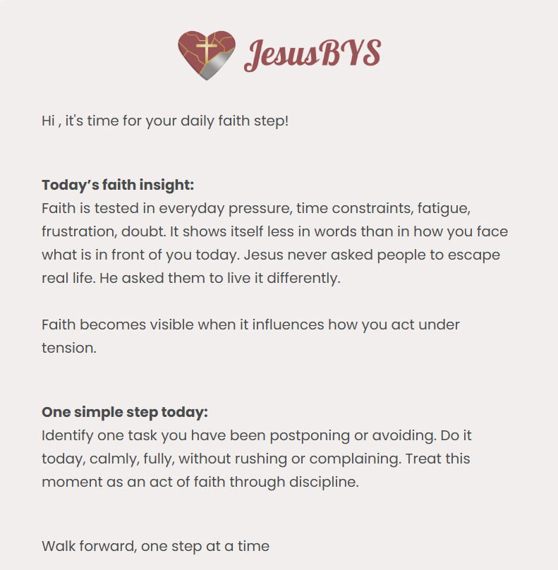 Every day, you receive one short email with one clear teaching inspired by Jesus and one practical step to apply it in real life.