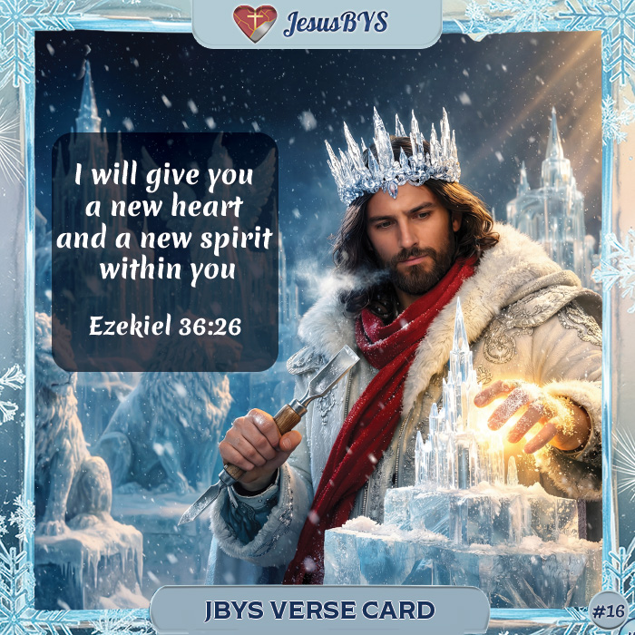 This original Ezekiel 36:26 Verse Card by JesusBYS features a striking cinematic digital illustration of Jesus portrayed as a powerful yet compassionate figure in a frozen kingdom. Wearing a crystal crown and a warm winter cloak, He stands in a snowy landscape while sculpting a glowing ice castle with His hands. The soft golden light radiating from His touch contrasts with the cold icy environment, symbolizing transformation and divine renewal.