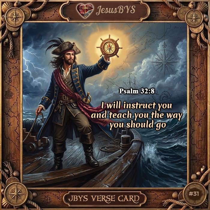 This original Psalm 32:8 Verse Card by JesusBYS features a dramatic cinematic illustration of Jesus portrayed as a seasoned navigator standing on the deck of a ship during a powerful storm. Dressed in a captain’s coat and holding a glowing compass high above the waves, He looks confidently toward the horizon as lightning flashes across the sky and turbulent waters surround the vessel. The scene captures the intensity of life’s storms and the assurance of divine guidance.