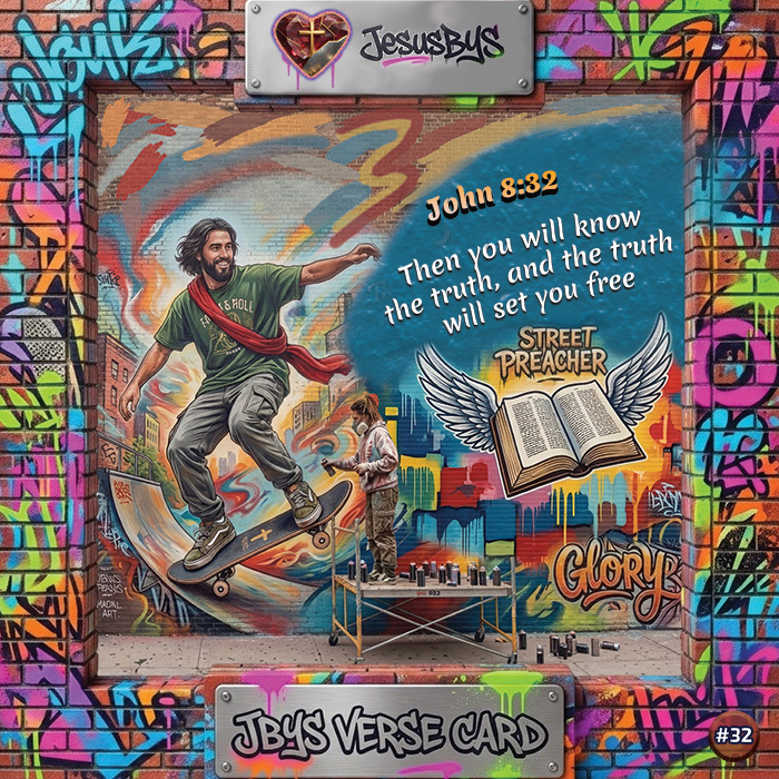 This original John 8:32 Verse Card by JesusBYS features a vibrant urban digital illustration of Jesus skateboarding through a colorful street art environment filled with graffiti, murals, and creative expression. Wearing casual modern clothing and a flowing red scarf, Jesus performs a dynamic skateboard move on a ramp while a street artist paints a mural nearby. The energetic scene reflects freedom, movement, and transformation within a modern city setting.