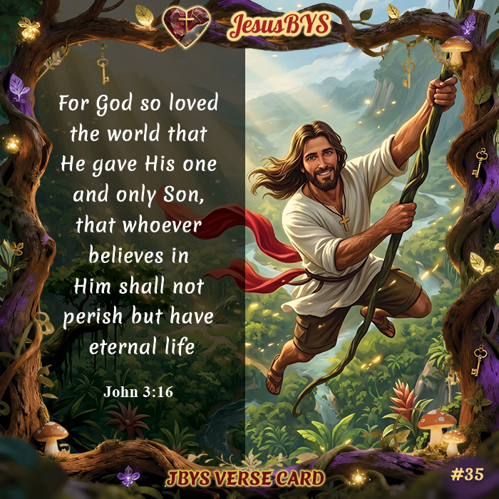 This original John 3:16 Verse Card by JesusBYS features a vibrant cinematic digital illustration of Jesus joyfully swinging through a lush, living forest filled with light, greenery, and hidden details. Holding onto a vine and moving freely through the landscape, He smiles with warmth and openness, symbolizing life, freedom, and the invitation to relationship. The scene is framed by twisting tree branches adorned with small glowing elements and keys, adding a sense of mystery and divine access.