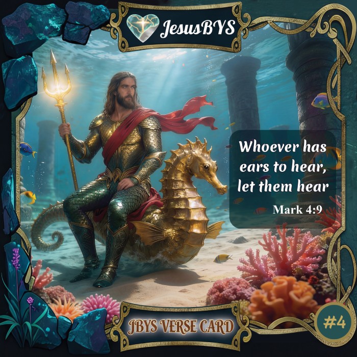 This original Mark 4:9 Verse Card by JesusBYS features a majestic and symbolic digital illustration of Jesus portrayed as a powerful underwater guardian, seated upon a golden seahorse in the depths of a luminous ocean. Clad in regal, scale-like armor and holding a radiant trident, Jesus appears calm, watchful, and authoritative amid ancient submerged ruins and vibrant coral reefs.