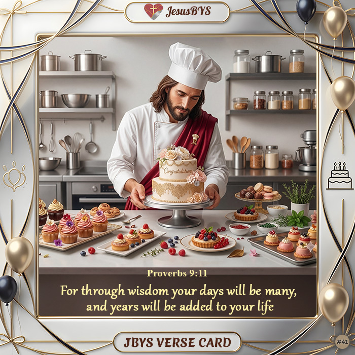 This original Proverbs 9:11 Verse Card by JesusBYS features a warm and elegant cinematic digital illustration of Jesus portrayed as a skilled chef in a beautifully organized kitchen. Carefully decorating a cake surrounded by pastries, fruits, and desserts, He works with precision and care, embodying creativity, patience, and mastery. The soft lighting and refined setting create an atmosphere of celebration, preparation, and thoughtful craftsmanship.